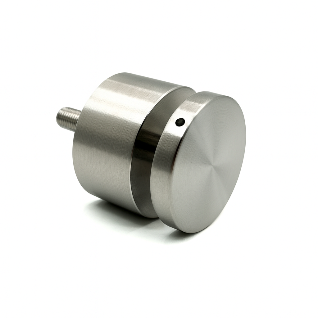 Clean, low-profile glass adapter with a domed cap and spacer for mounting glass to flat surfaces.