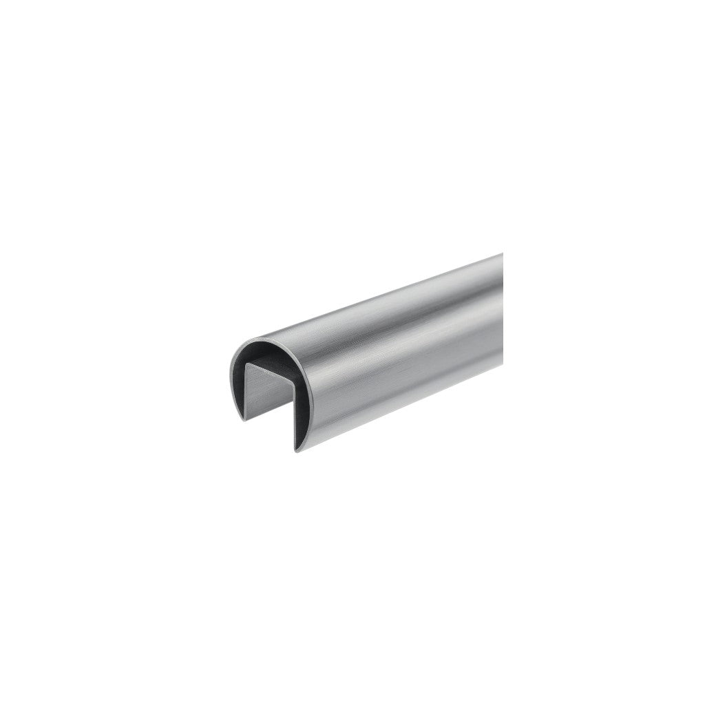Snap-on cap rail for finishing/covering round handrail tubes.