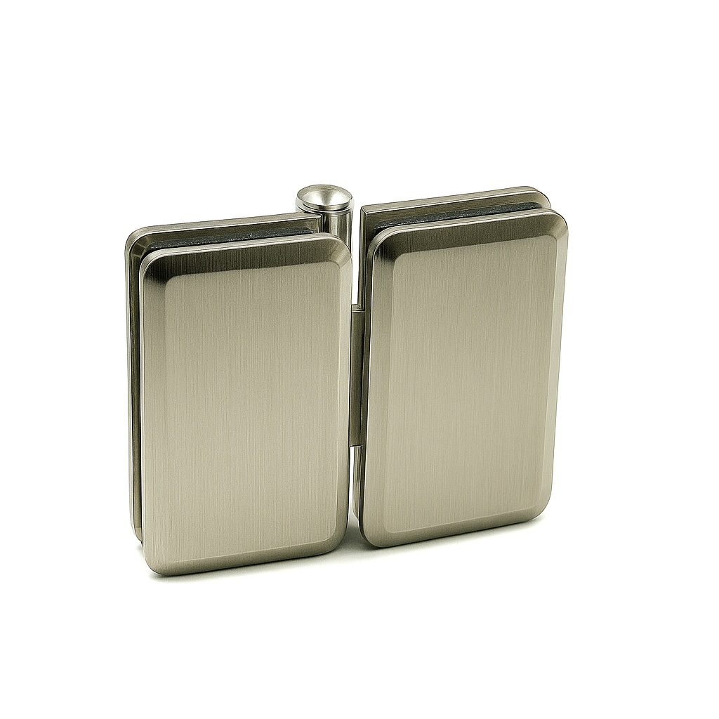 180° swing hinge for mounting a shower door to a fixed sidelight. Solid brass construction for durability. Suitable for 6–10 mm glass and doors up to 45 kg.