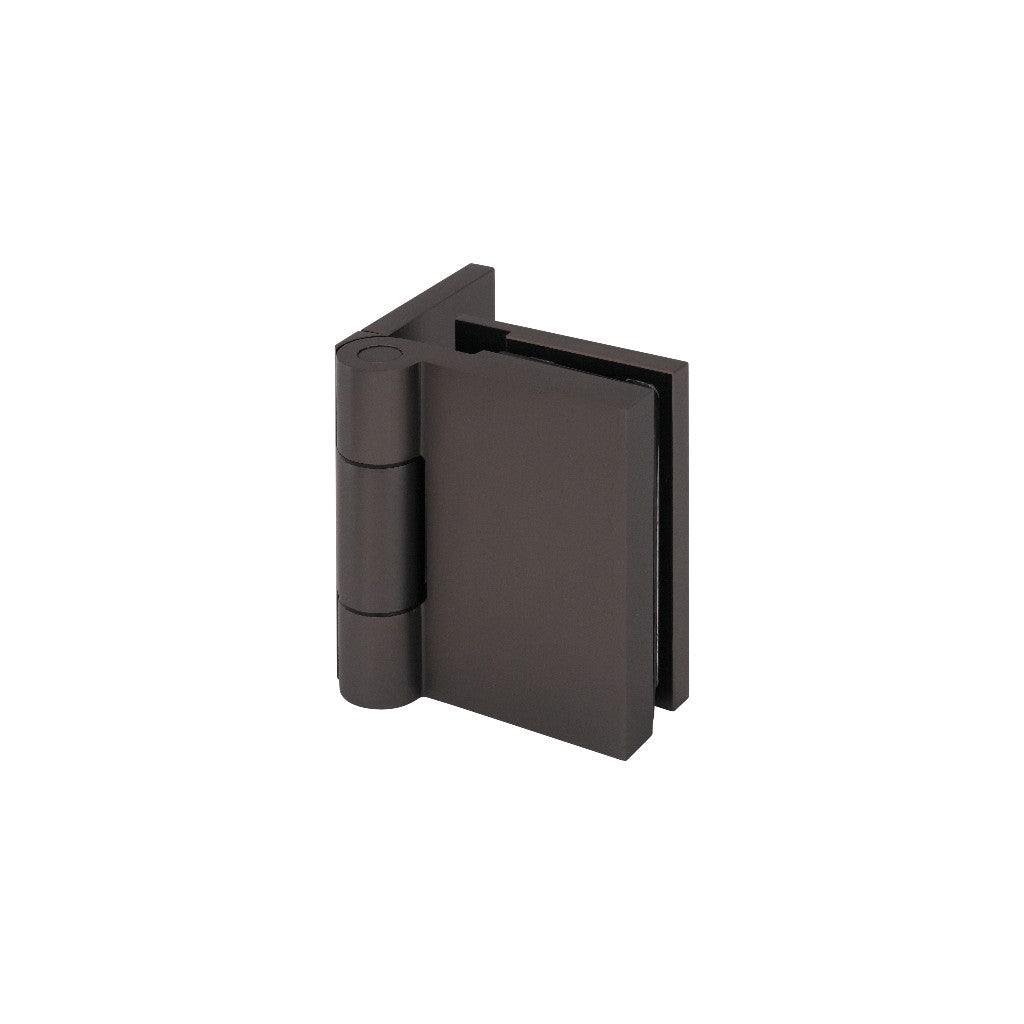 90° wall-to-glass hinge for mounting a shower door to a wall or fixed panel. Solid brass body, rated for doors up to 45 kg and compatible with 6–10 mm tempered glass.