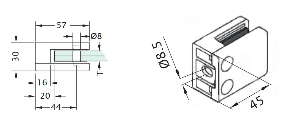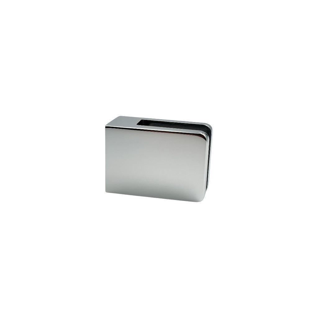 Square glass wall clamp for neat, secure indoor installations. Designed for 10–12 mm glass and available in two compact face sizes.
