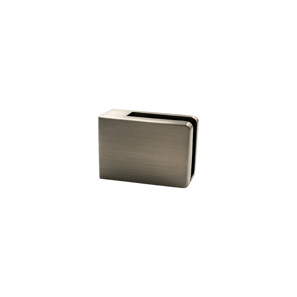 Square glass wall clamp for neat, secure indoor installations. Designed for 10–12 mm glass and available in two compact face sizes.