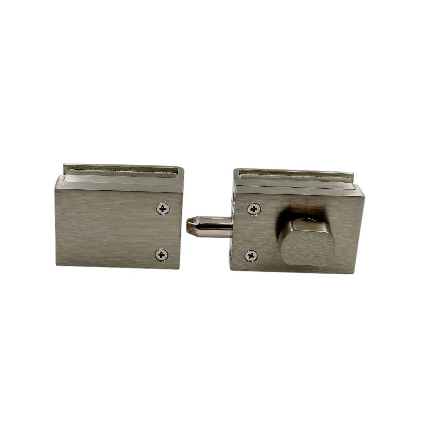 Surface-mount lock set for frameless shower doors—no glass cut-out required. Clamps directly onto the glass and includes both the lock body and keep.