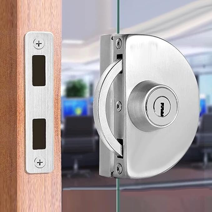 Clamp-on lock for single frameless glass doors that secure to a wall keep/strike. No drilling into the glass required; an integrated cushion pad protects the glass surface.