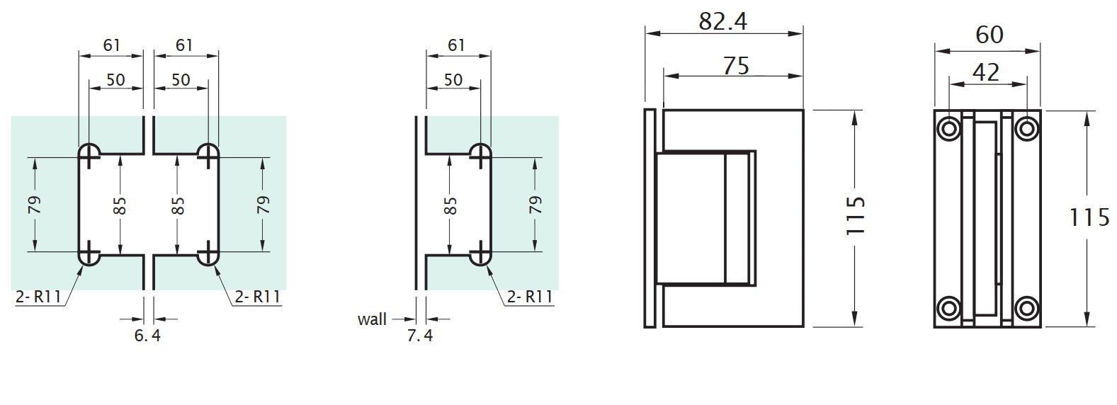 Hydraulic, self-closing hinge for frameless glass shower doors. Designed for smooth, controlled closing and a clean 90° wall-to-glass installation.