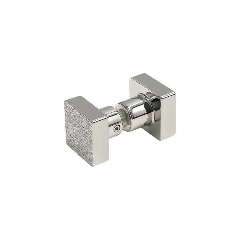 Textured square-face, back-to-back pull knobs for frameless glass doors. Secure grip and a clean, modern look.