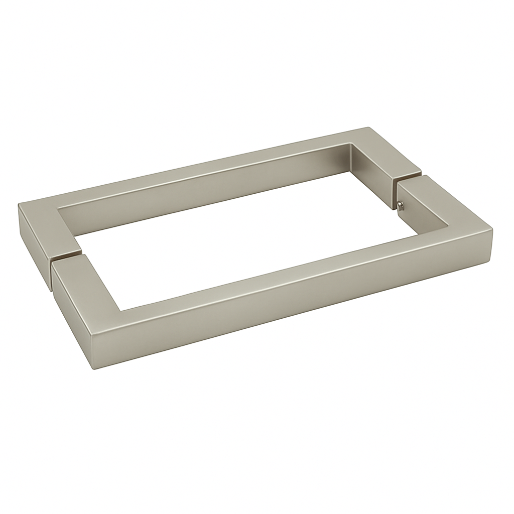 Modern square-profile pull handle with a smooth satin nickel finish. Designed for clean, through-bolt installation on glass or door panels.