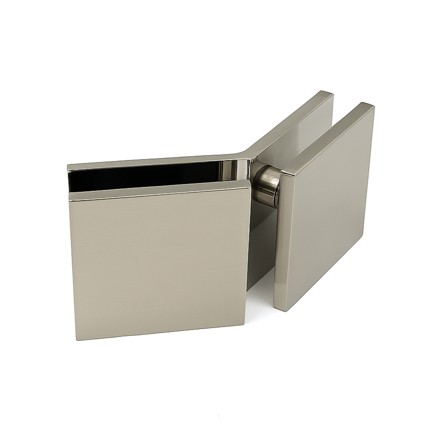 135° swing hinge for mounting a shower door to a fixed sidelight. Solid brass construction for durability. Suitable for 6–10 mm glass and doors up to 35 kg.