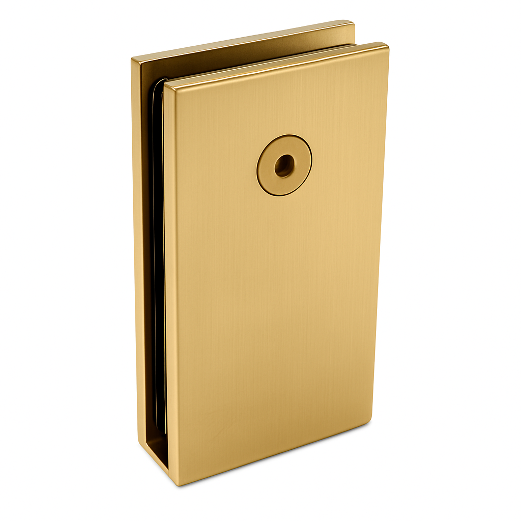 Wall-to-glass clamp for securing support bars to tempered glass panels. Fits 6–10 mm glass; rated for doors up to 35 kg.