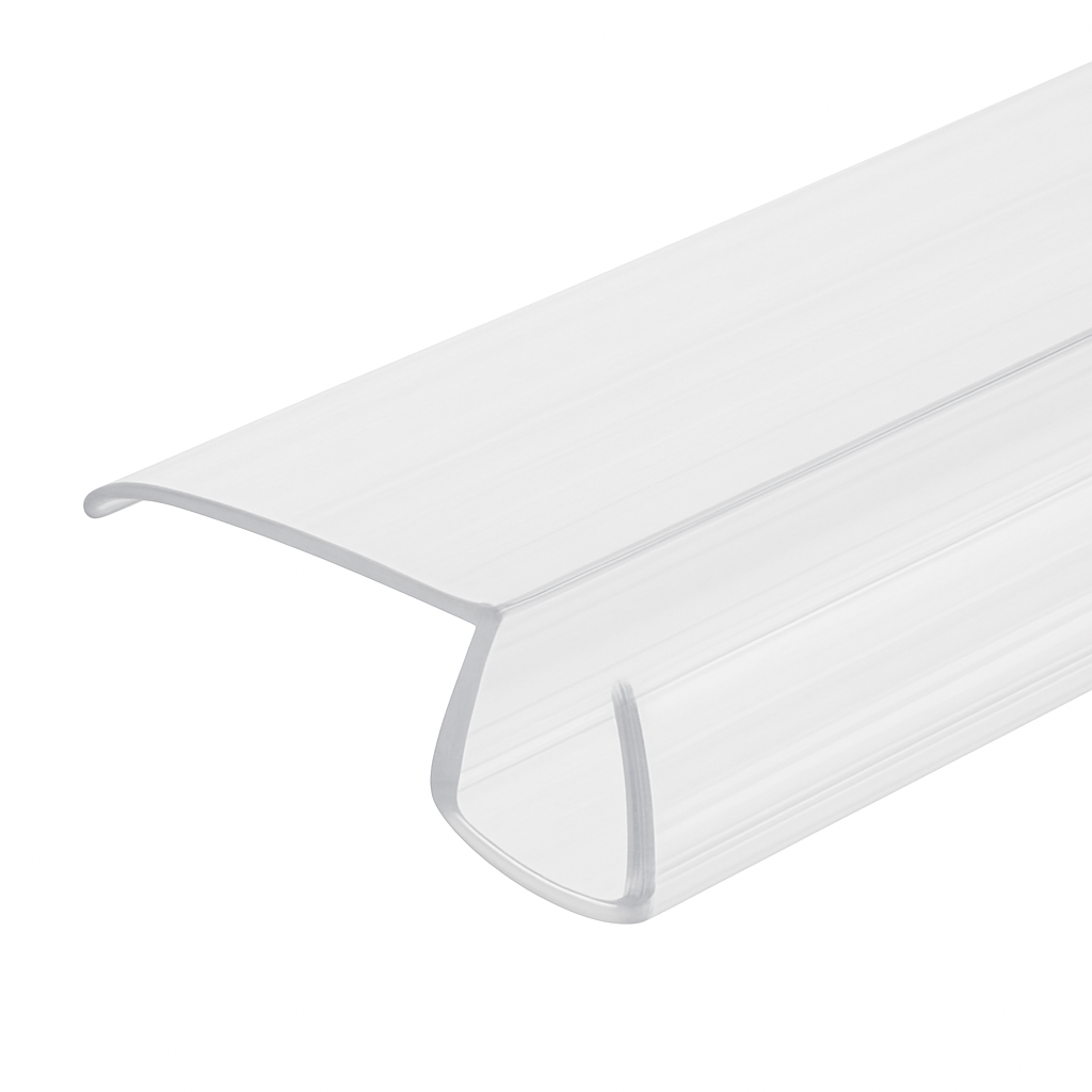 Snap-on bottom sweep for frameless shower doors. Features an extended wipe fin to bridge larger gaps and deflect water back into the enclosure—no drilling required.