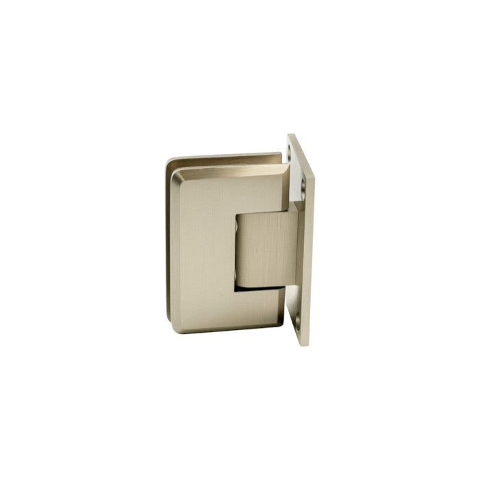 Full-plate 90° hinge for mounting a shower door to a wall or fixed panel. Solid brass construction with smooth self-centering when the door is within 25° of closed. Suitable for smaller panels and 6–8 mm glass.