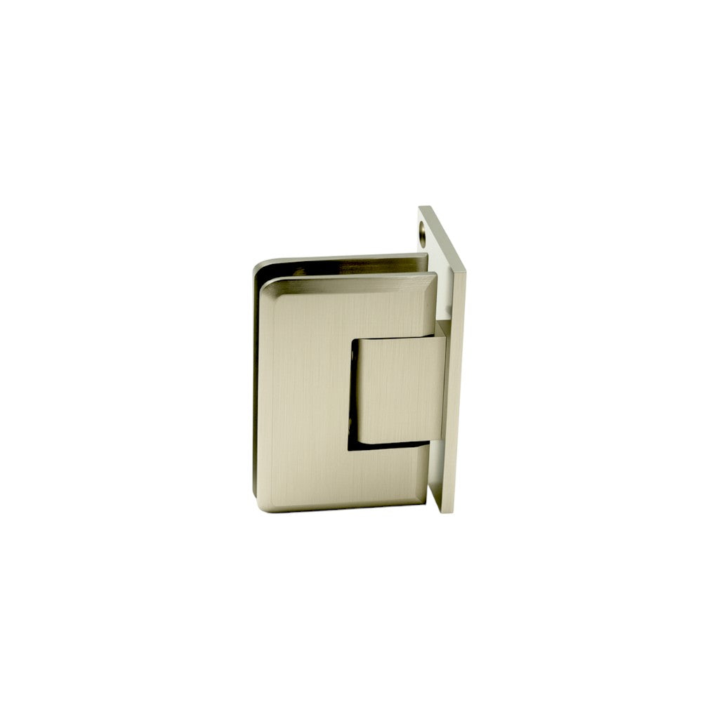 Offset-plate 90° hinge for mounting a shower door to a wall or fixed panel. Solid brass construction with reliable self-centering when the door is within 25° of closed. Suitable for lighter panels and 6–8 mm glass.