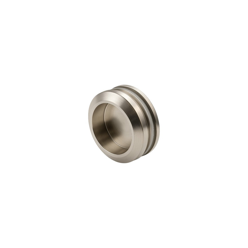 Low-profile sliding door handle (flush pull) for frameless glass doors.